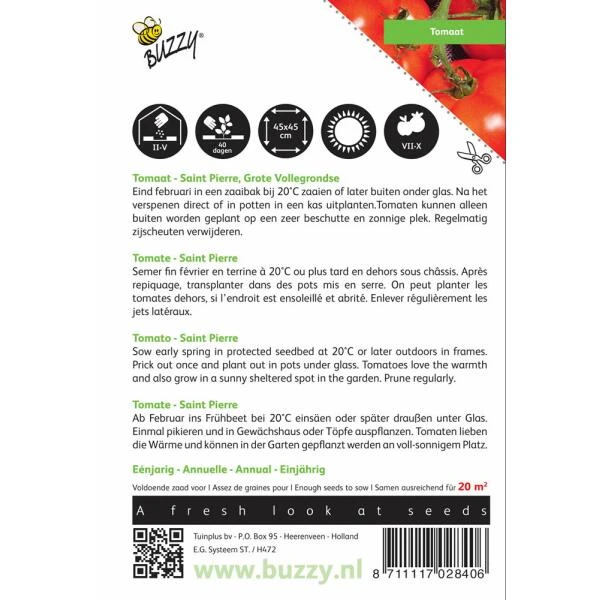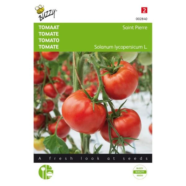 Tomaten St. Pierre. Tijd van zaaien tot oogsten: ca. 80 dagen. Kiemduur: 7 tot 14 dagen